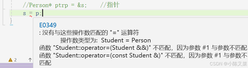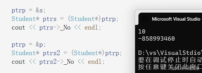 cout << ptrs2->_No << endl; 大家可以看一下这段代码的最后两部分,我们都试图通过使用强制类型转换的方式将基类指针赋值给派生类,但是仔细阅读会发现还是有所区别,前置ptrp指向派生类,后者ptrp指向基类:
