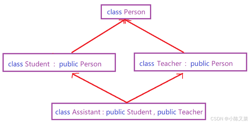 从上面的图中可以看出,因为Assistant同时继承了Student和Teacher,所以就会导致有两份Person成员: