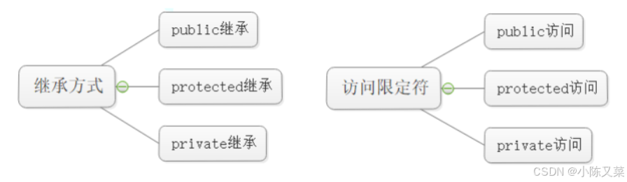 继承关系除了上面讲到的公有继承(public),还包括保护继承(protected)、私有继承(private),在加上基类成员本身的访问限定,所以组合之后会有9中访问关系。