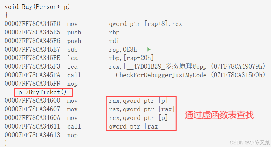 下面这段代码中,Buy()函数,如果传入的是Person调用的就是Person::BuyTicket(),传Student调用的是Student::BuyTicket。这样就构成了多态,而多态的调用实现,是依靠运行时,去指向对象的虚表中查调用的函数地址。