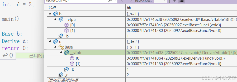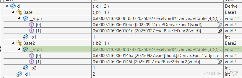 我们通过调试先来看一下对象d的虚函数指针:
