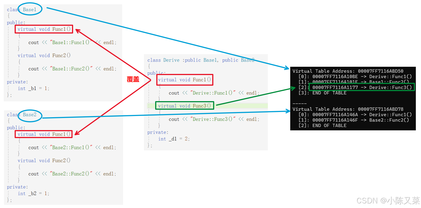 然后通过打印的结果我们可看出派生类新增的虚函数一般会储存在第一个继承基类的虚函数表中: