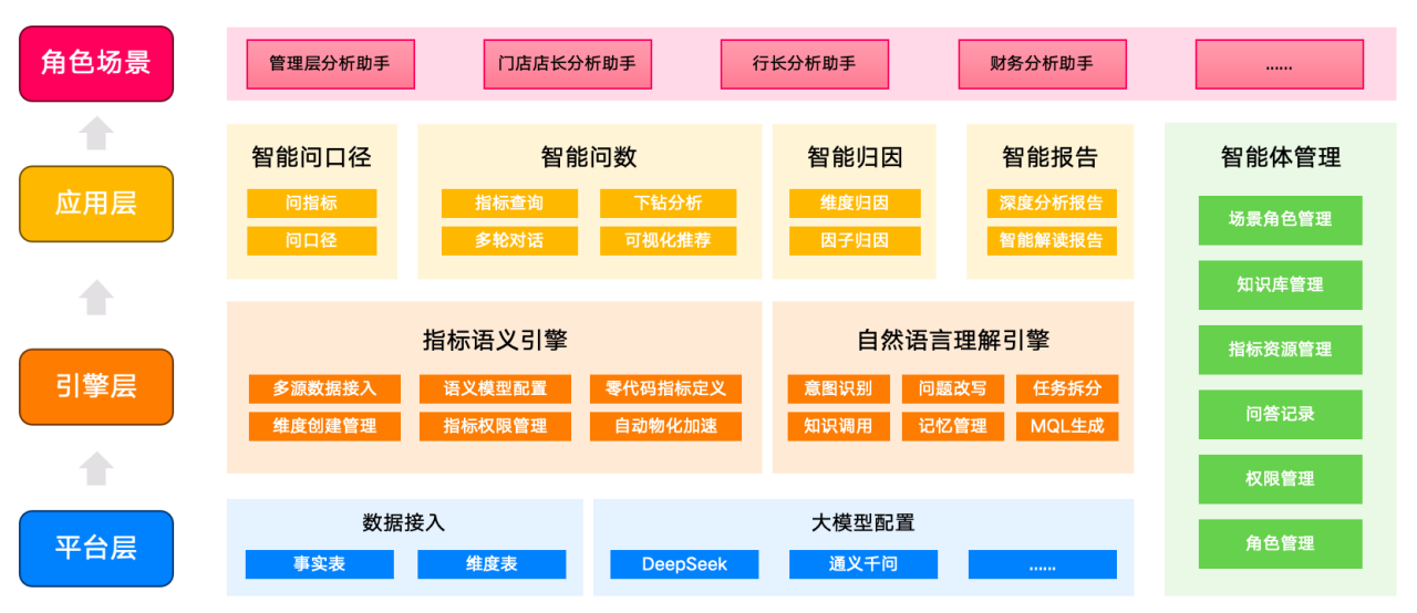 用户两种角色:数据人员和终端业务用户。数据人员负责数仓 DWD 层模型维护、指标平台数据集的接入与逻辑建模、基础度量和维度的定义与管理;终端用户基于自身的需求,拖拽指标与维度进行快速分析,或通过问数界面进行自然语言分析,无需理解数据结构。