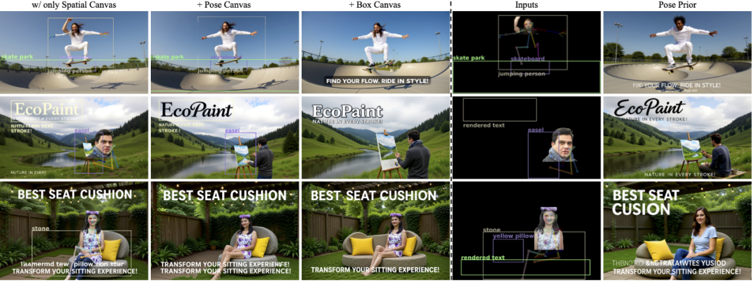 关键发现:虽然训练时使用单任务画布,但模型自然学会了在推理时组合多种控制——这种涌现能力验证了我们的设计理念。