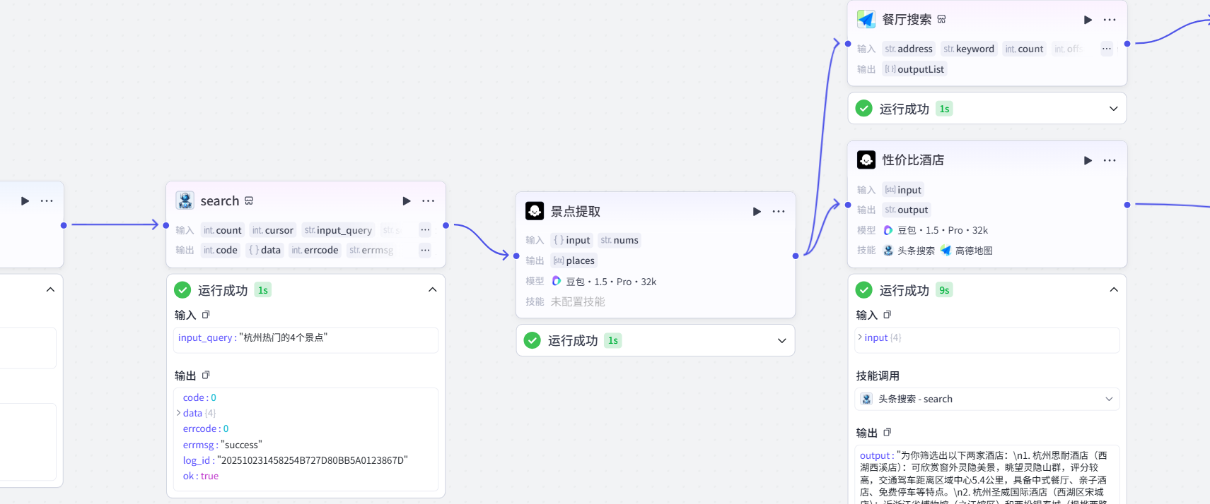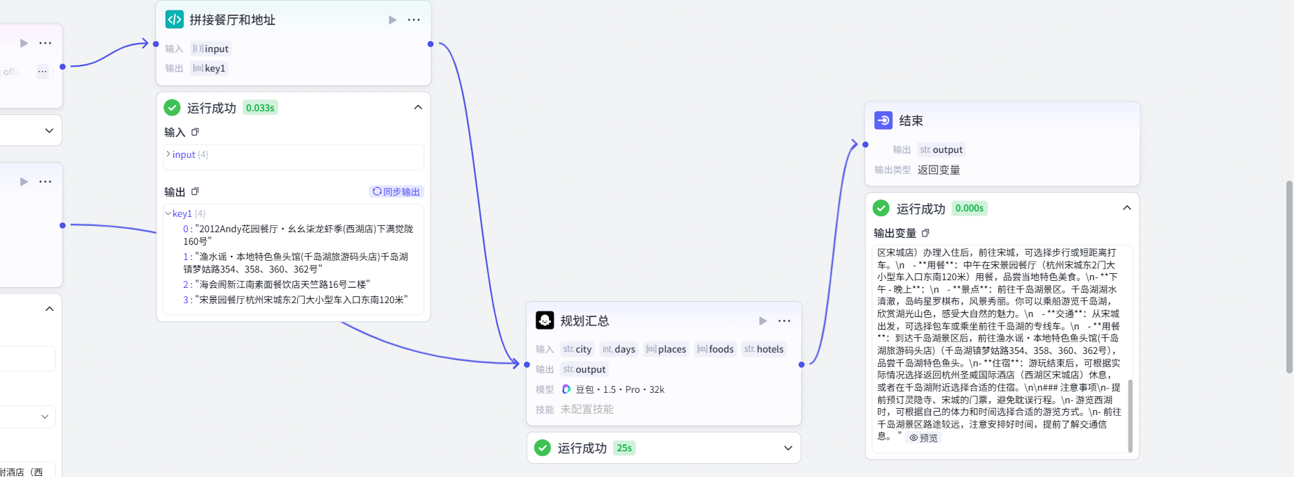 敲完最后一个测试节点的代码时,看着旅游助手自动输出的完整行程 —— 从景点推荐到餐厅地址拼接,再到酒店匹配,突然觉得这就是技术最可爱的样子:它不一定需要多复杂的算法,却能把我们从 “打开十个网页反复切换” 的琐碎里解放出来。 其实工作流智能体的魅力,就藏在这些 “小而美” 的场景里:无论是规划一次旅行,还是整理一份周报,本质上都是用代码给重复的步骤 “画一条自动路”。而我们,就能腾出时间去想更有趣的事 —— 比如旅行时该带哪件外套,而不是纠结 “下一个景点附近有什么吃的”。 如果你也试着搭了自己的工作流智能体,欢迎在评论区分享你的创意场景~ 毕竟,让技术服务于生活,才是我们敲代码时最温暖的初心呀。