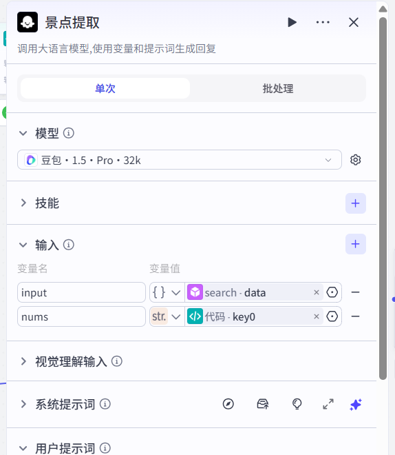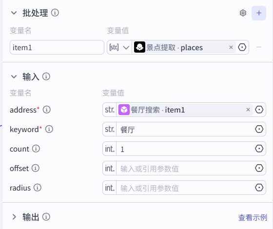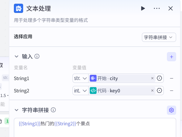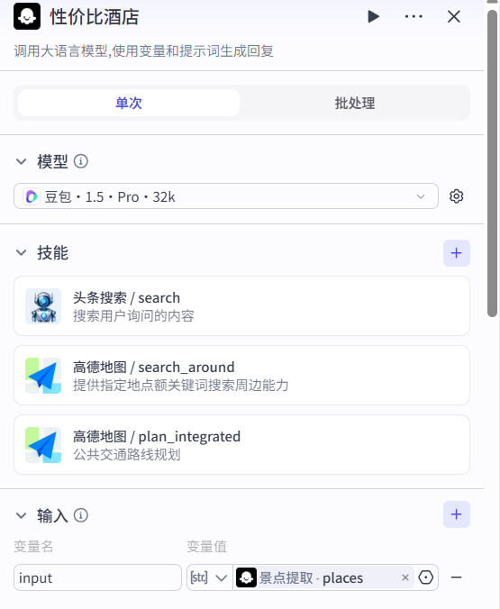 通过文本处理,整合成关键话题,某城市热门的nums个景点,再用头条搜索,进行网页搜寻 通过大模型提炼头条搜索节点输出的内容,将出现频率次数高的前几个景点提取出来,返回一个places数组。