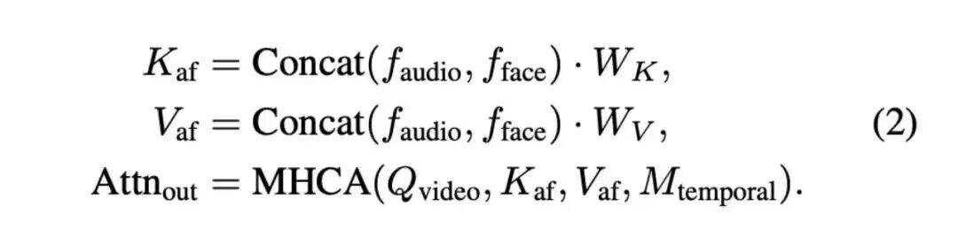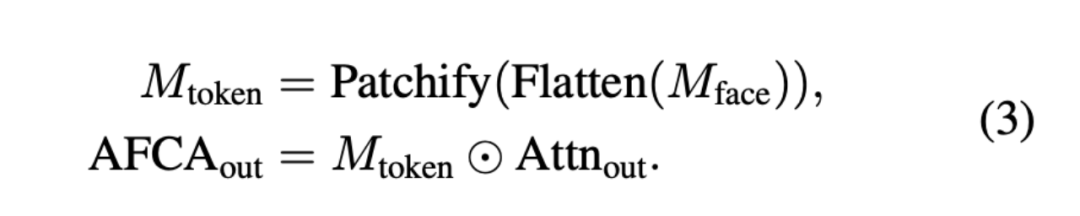 其中,MHCA 表示多头交叉注意力,W_K和 W_V分别表示键矩阵和值矩阵。注意力输出 Attn_out将随后由人脸掩码 token 进行调整,如公式(3)所述。