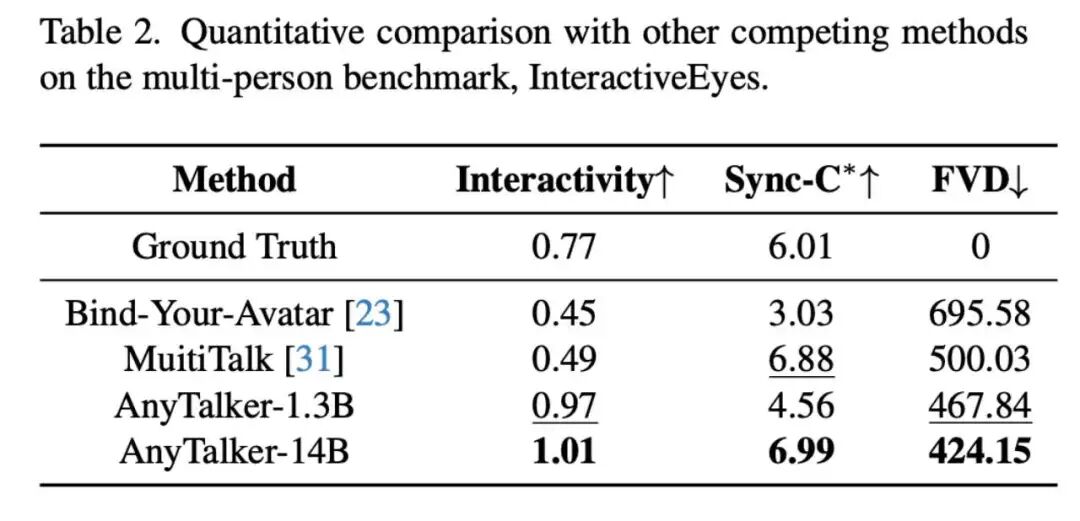 随后,我们使用多人数据集 InteractiveEyes 及相关指标评估 AnyTalker 在驱动多个身份时保持准确唇同步和自然交互性的能力。在此对比中,我们将 AnyTalker 与现有的开源多人驱动方法 MultiTalk 和 Bind-Your-Avatar 进行对比。表2中的结果显示,AnyTalker 的1.3B和14B模型在 Interactivity 指标上均取得了最佳性能。此外,14B模型在所有指标上均取得了最佳结果,从而验证了我们提出的训练流程的有效性。我们还通过定量评估展示了 AnyTalker 生成富含交互性的视频的能力。