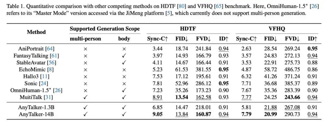 对比方法。我们与几种最先进的说话视频生成方法进行比较。对于单人生成,我们与 AniPortrait、EchoMimic 、Hallo3、Sonic、FantasyTalking、StableAvatar、OmniHuman-1.5 和 MultiTalk进行比较。对于多人生成,我们选择 Bind-Your-Avatar和 MultiTalk进行定量和定性比较。