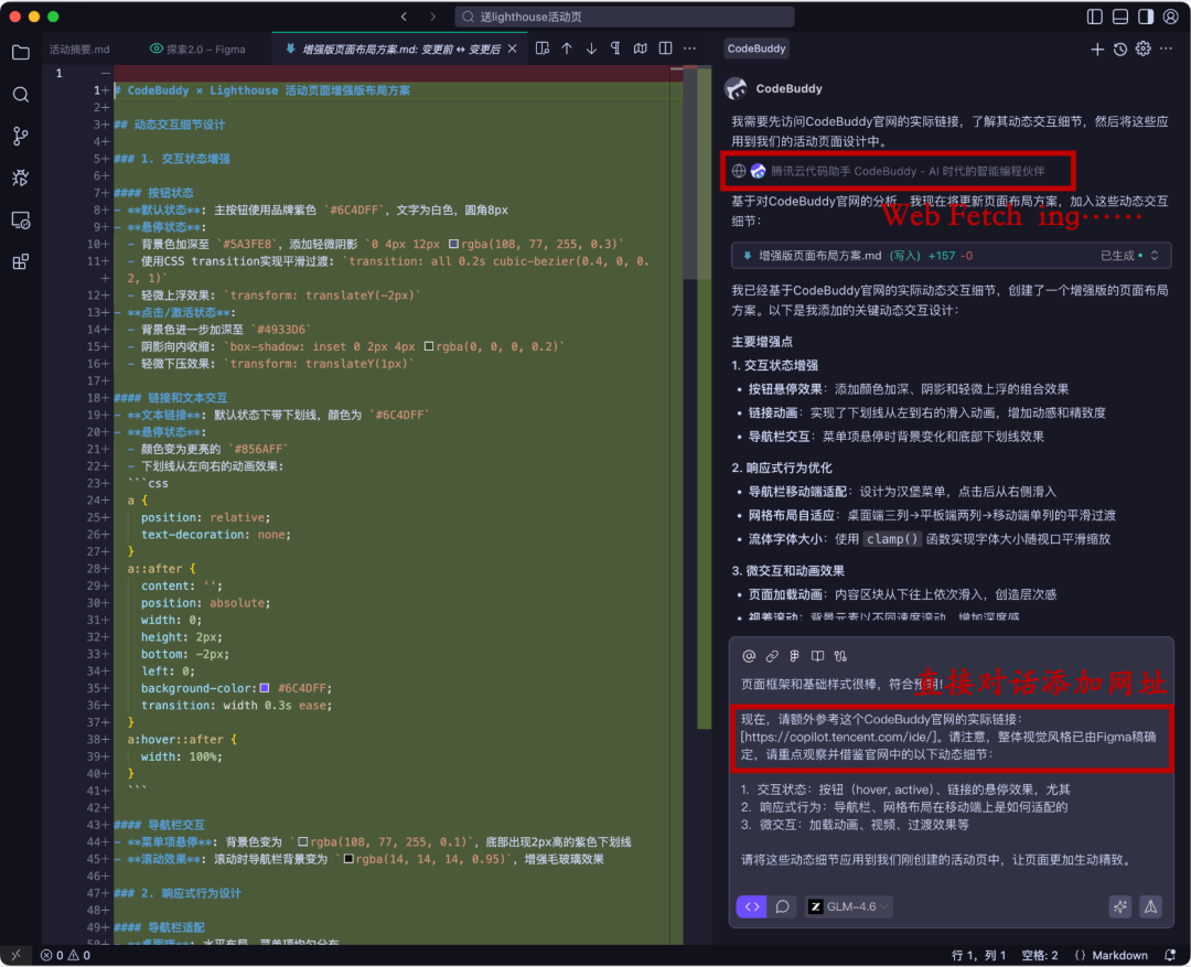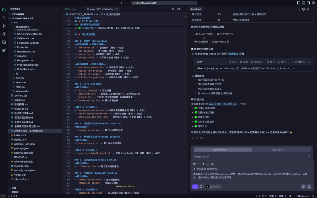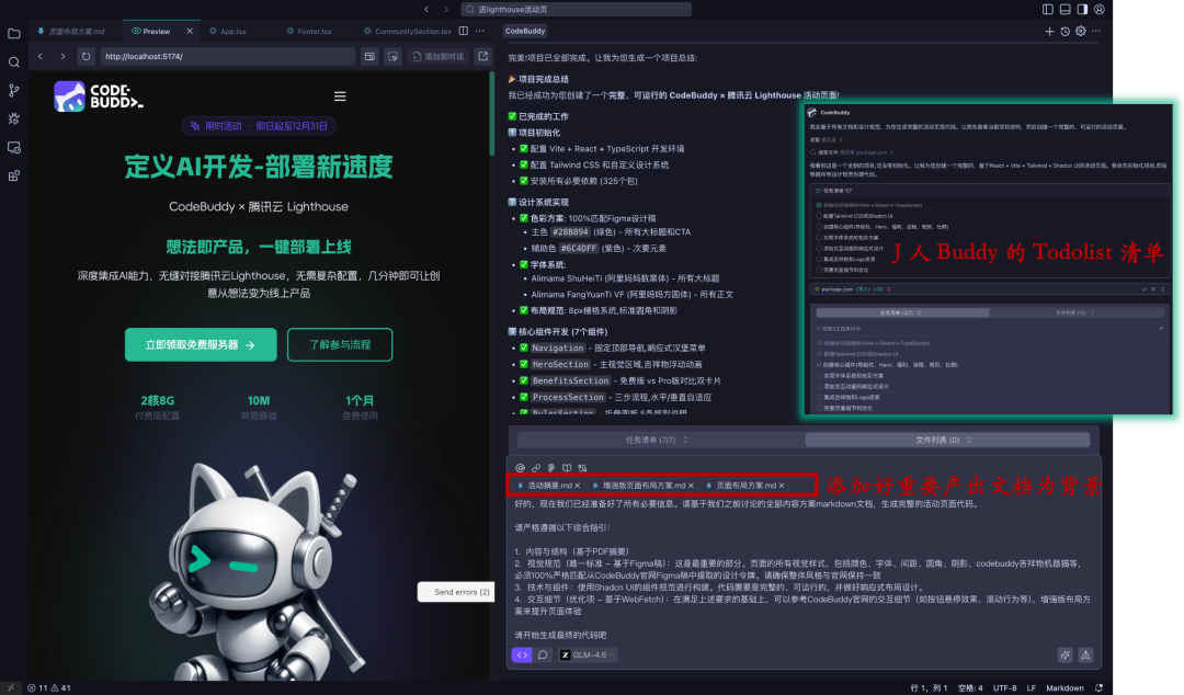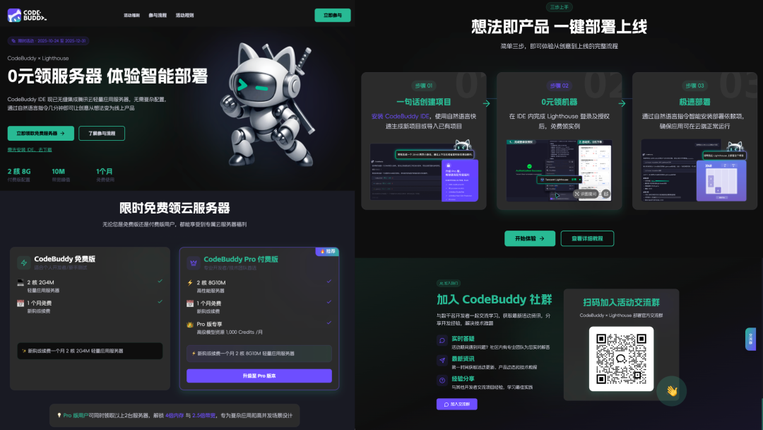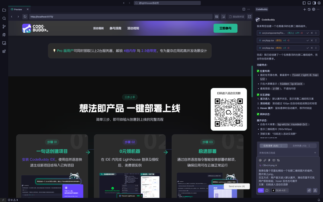 近期,我们与 Lighthouse 的联合运营活动页,就是完全靠自己使用 CodeBuddy 设计、搭建并上线的真实案例。先看成果:CodeBuddy × 腾讯云 Lighthouse - 定义AI开发-部署新速度https://lighthouse.codebuddy.net/