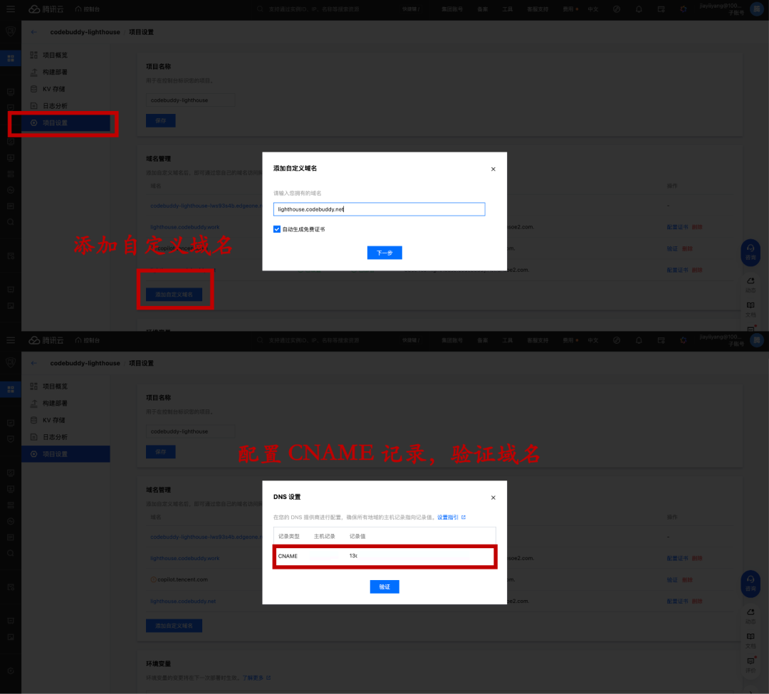 进入 EdgeOne 控制台输入域名后根据弹窗中提供的 DNS 记录信息,前往你的域名注册商网站,配置相应的 CNAME 记录。等待域名验证成功后,系统将自动为你的域名配置 SSL 证书,为网站开启安全加速的访问!