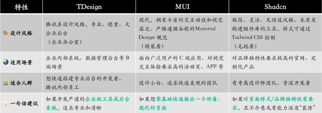 这里有必要再给大家展开讲讲我们对于 CodeBuddy 内置的三个组件库的实践理解和选择建议,仅供参考(CodeBuddy 仍在丰富组件库中,敬请期待!)
