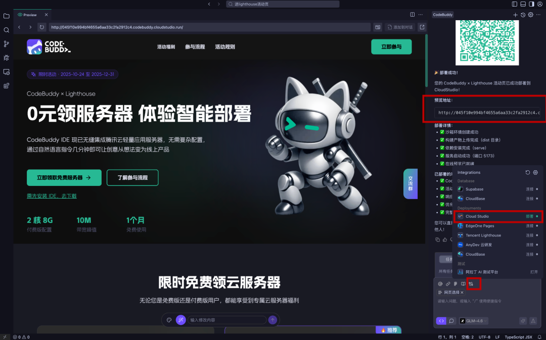 接下来,预览验证无误后,即可正式部署上线。CodeBuddy 内置了多种部署方案,您可根据业务背景灵活选择。当然包括我这次活动页设计的主角「腾讯云轻量应用服务器 Lighthouse」 的一键部署。