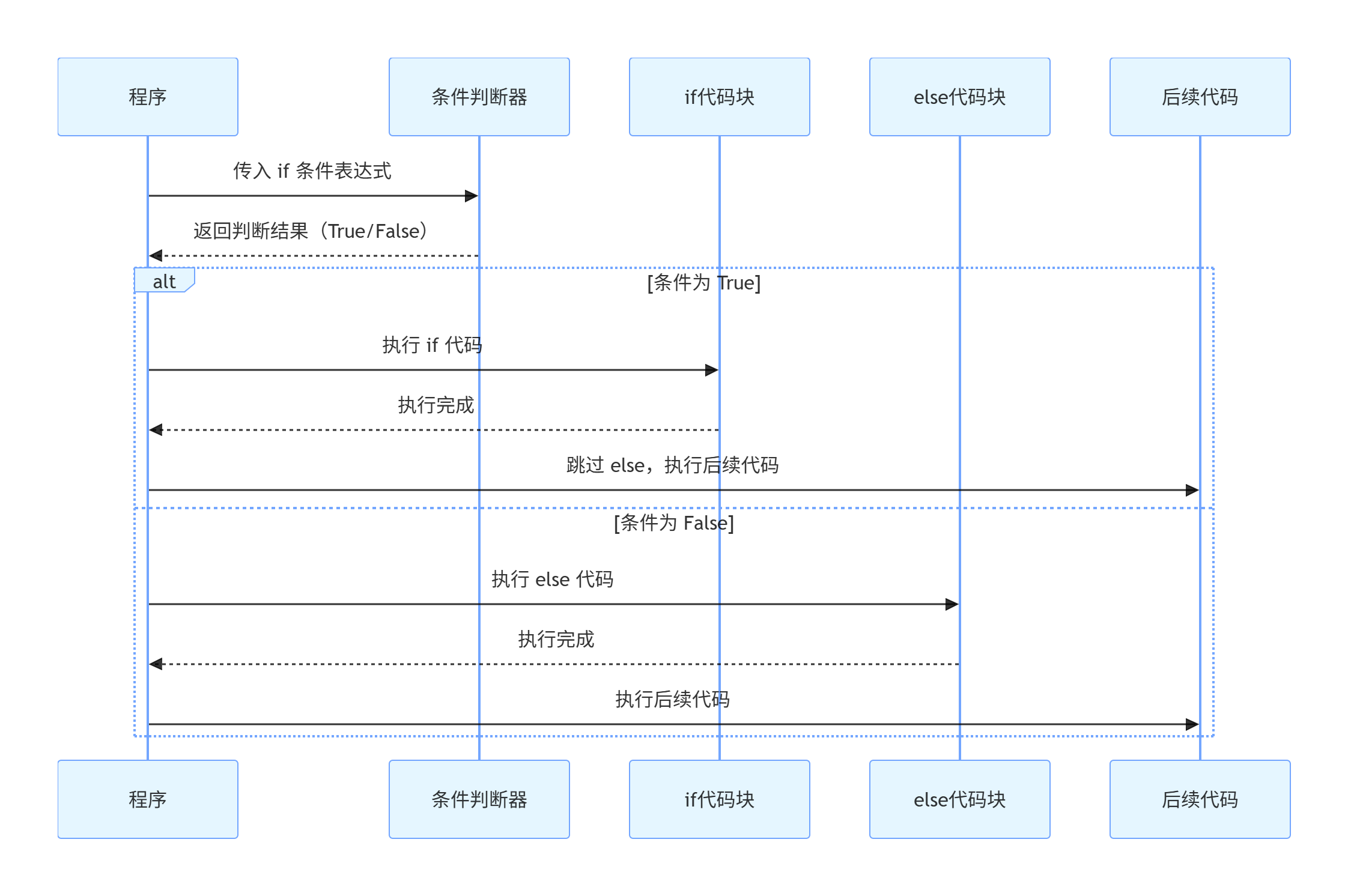 if 语句的条件为 True,则执行 if 块中的代码,跳过 else 块中的代码。if 语句的条件为 False,则跳过 if 块中的代码,执行 else 块中的代码。这意味着 if 和 else 语句是互斥的,一旦选择了其中一个分支,就不会再执行另一个分支的代码。