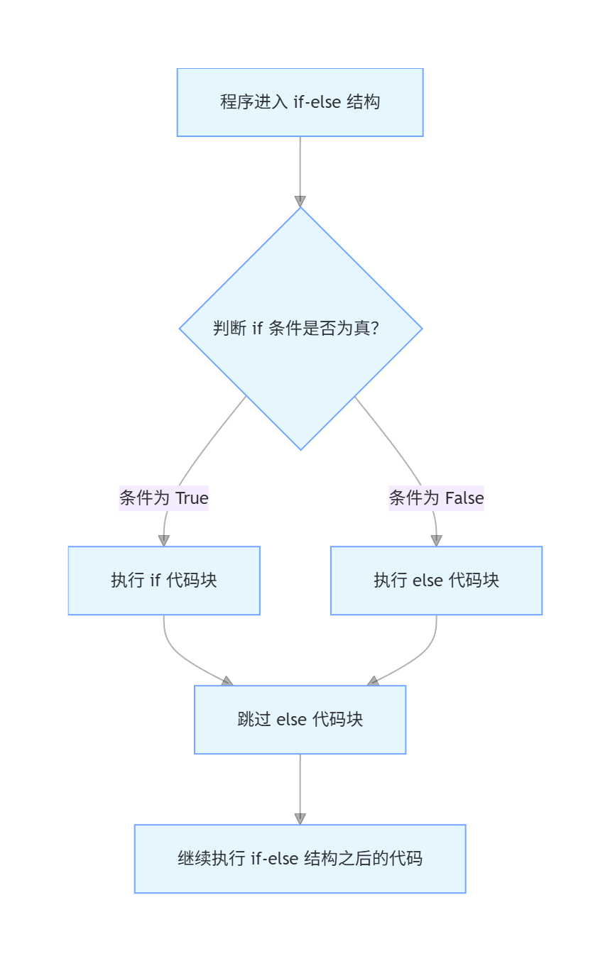 if-else 语句在编程中用于根据条件选择性地执行代码块。当条件为真时,执行 if 块中的代码;当条件为假时,执行 else 块中的代码。重要的是,一旦其中一个块被执行后,程序会跳过另一个块,继续执行后续代码。