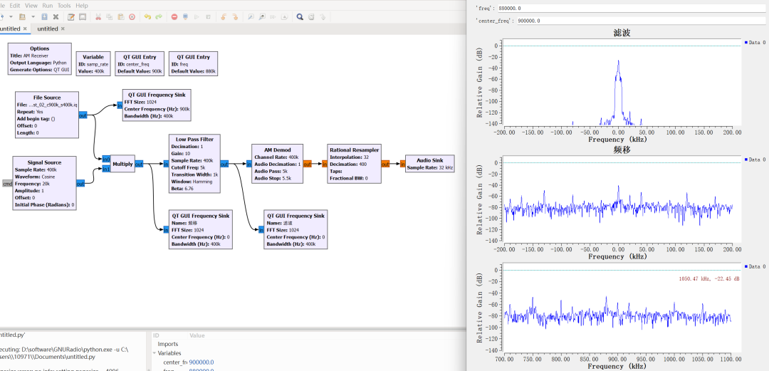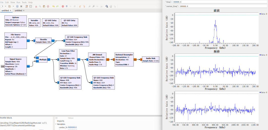OK,我们回到正题,在 Multiply 和 Low Pass Filter 之后都加入一个 QT GUI Frequency Sink,运行观察波形,最下面的是 File Source 直接出来的波形,我们设置了中心频率为 900kHz;中间的是与 Signal Source 相乘偏移后的,因为没有特意设置中心频率所以以 0Hz 为中心频率,Signal Source 中正弦信号频率为 20kHz,所以大概可以在最下面波形中 880kHz 处看到现在 0Hz 处的频率,不过波形好像匹配不起来?不是说与一个正弦信号相乘只会偏移吗
