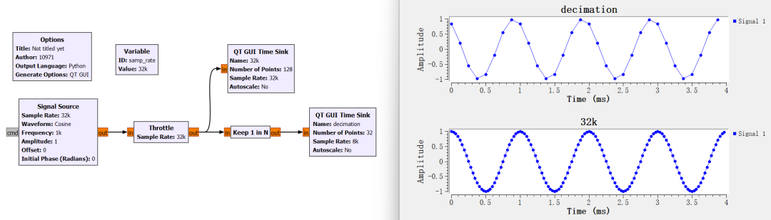 下面直接新建一个流程图看一下抽取的效果,注意所有类型均为 float。新建一个 Signal Source 频率为 1kHz,其后添加 Throttle 模块,然后接一个 Keep 1 in N 模块用来进行抽取(意思是:在 N 个采样点中保留一个)其中 N 设置为 4