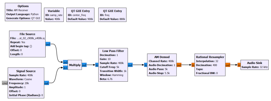 到此了解了在 GNU Radio 中实现 AM 接收器的流程图大概的原理,下一节将会搭建一个 FM 接收器