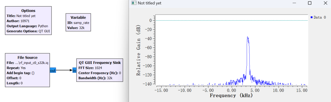 使用 File Source 打开 ch_06/rf_input_c0_s32k.iq 文件,通过 QT GUI Frequency Sink 来观察频率