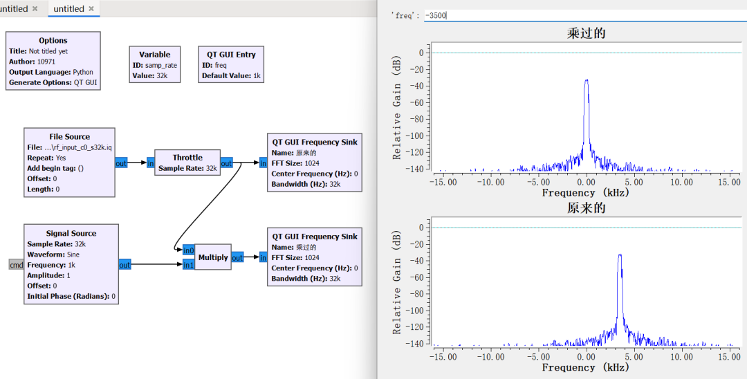 添加一个 Signal Source 与 File Source 相乘,然后也通过 QT GUI Frequency Sink 来观察频率,为了区分,给每个 QT GUI Frequency Sink 设置一下名字,这样一来可以很直观地看出,当原始的信号乘了一个 1kHz 的正弦信号会往右偏移 1kHz(我发现原书中虽然是叫正弦,但是他用的一直是默认的 cosine,可能因为俩函数本身形状一模一样,只是平移了 1/4 个周期,所以在实际信号调制解调中看没啥区别)