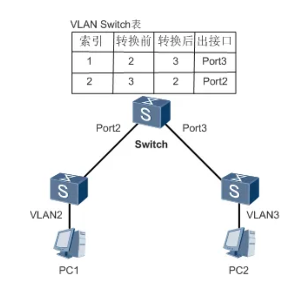 两个VLAN的用户分别连接在不同交换机上,中间经过中转交换机,通过VLAN Switch实现二层互通