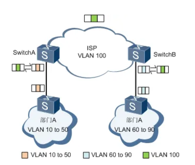 企业分支的不同VLAN用户,通过运营商网络实现通信,通过VLAN Mapping转换VLAN标签