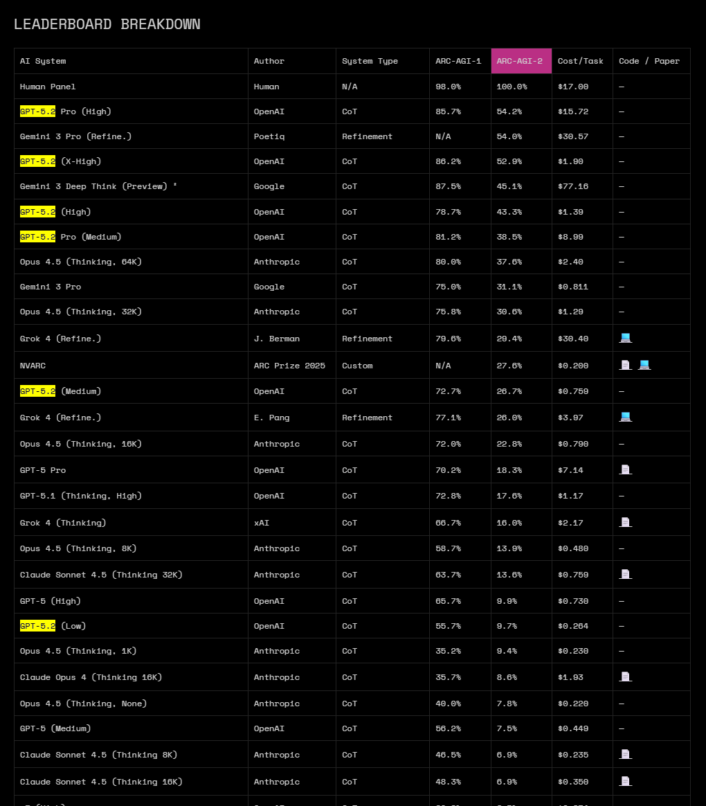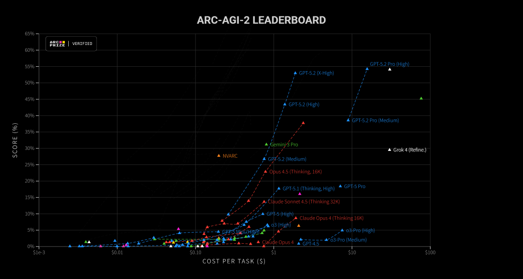 长期以来,各家顶级模型在 ARC-AGI-2 上的得分都惨不忍睹。