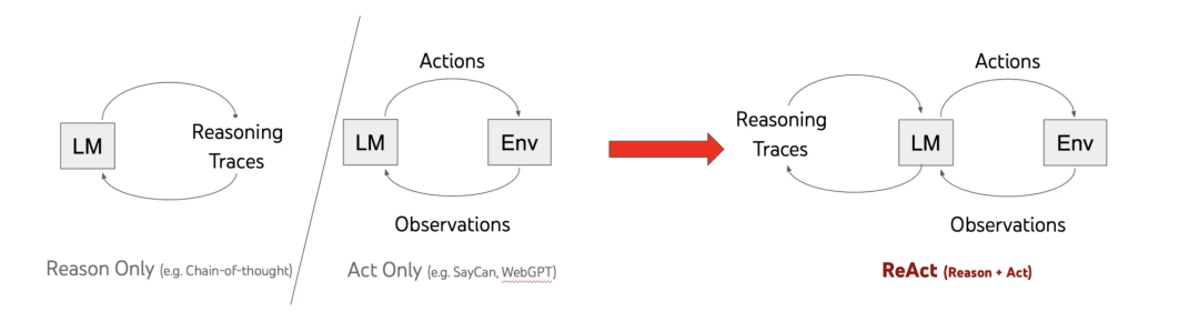 核心能力 | 推理与行动协同,自主决策 | 纯推理,无外部交互能力 | 工具调用,推理逻辑薄弱 | 行动优化,无显式推理 |