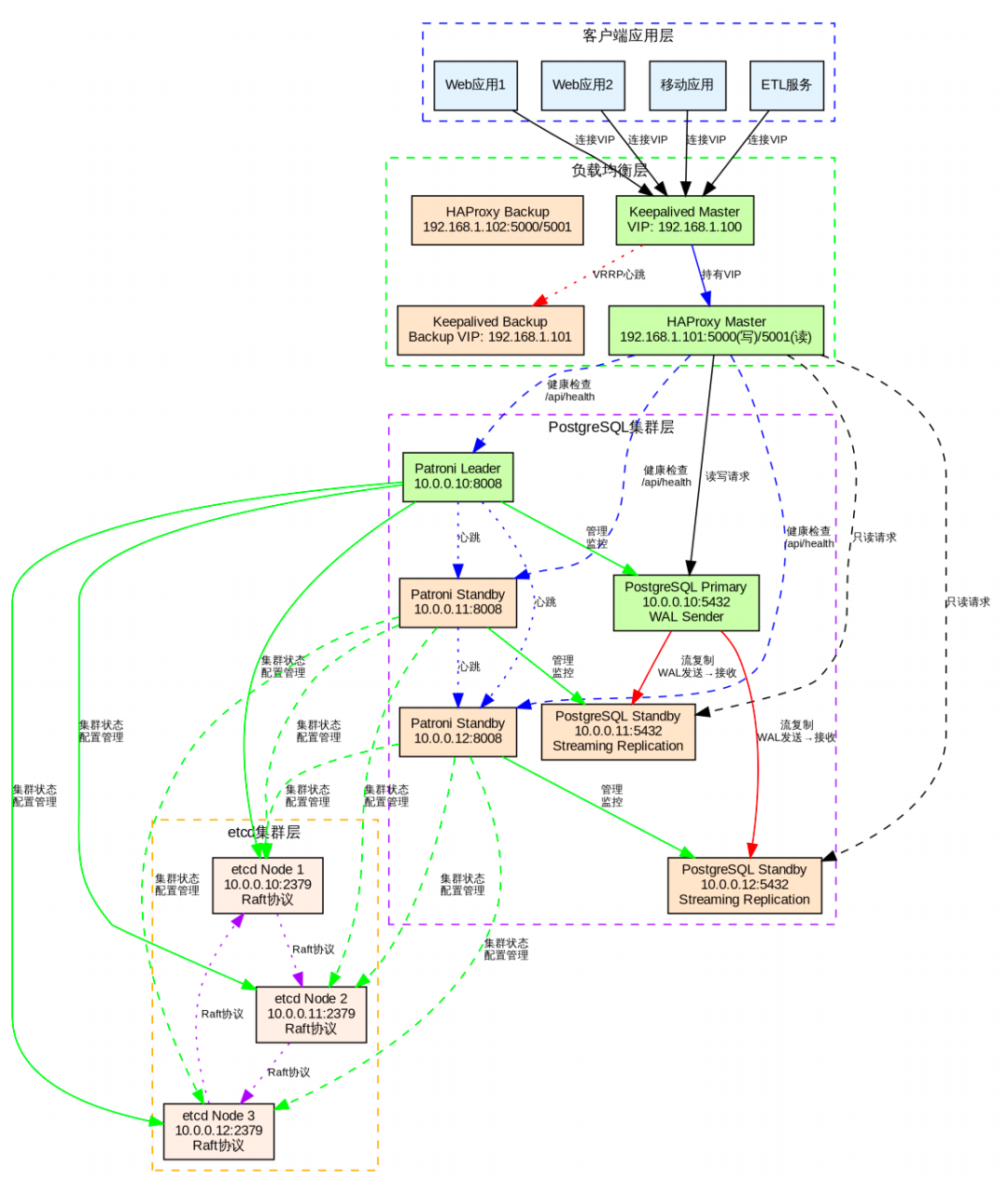 在以上的图中主要有一些的功能: 客户端应用层:业务系统通过统一 VIP 访问。 负载均衡层:HAProxy + Keepalived 实现智能路由,智能读写路由优化性能。 数据库集群层:PostgreSQL + Patroni 实现数据高可用,实现毫秒级切换,使业务无感知。 分布式一致性:ETCD 集群提供一致性保障,防止集群出现脑裂的现象。