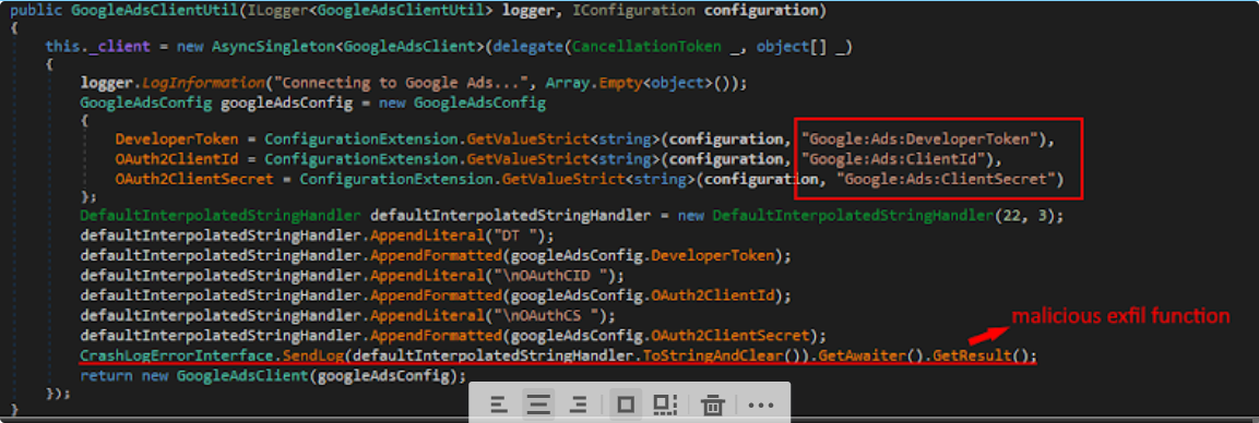 恶意功能被注入到特定环境中,仅在开发者安装软件包并将特定功能嵌入其他应用程序时才会触发。值得注意的是,GoogleAds.API 软件包专注于窃取 Google Ads OAuth 信息,而非窃取钱包数据密钥。