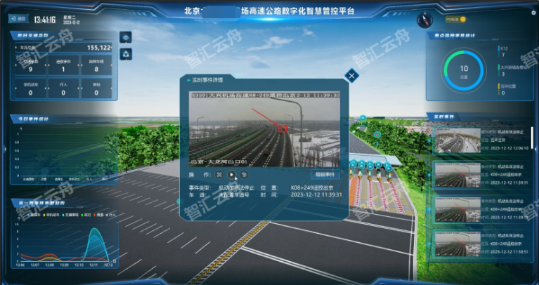 系统联动AI识别数据与空间智能定位技术,基于高速实景三维场景实现道路上交通事故、故障车辆、非机动车、行人、逆行等交通事件的及时发现和快速定位,事件发生时及时提醒,并联动场景快速定位,联动现场视频精准研判,同时可结合全景融合视频实现现场态势的实景态势全景研判,辅助进行科学处置,实现事件处置过程的便捷填报登记。同时,针对视频识别事件,可以在场景中通过空间智能感知技术联动展示附近作业车辆,可选择与现场车辆进行一键可视对讲调度,实现事件的高效处置。