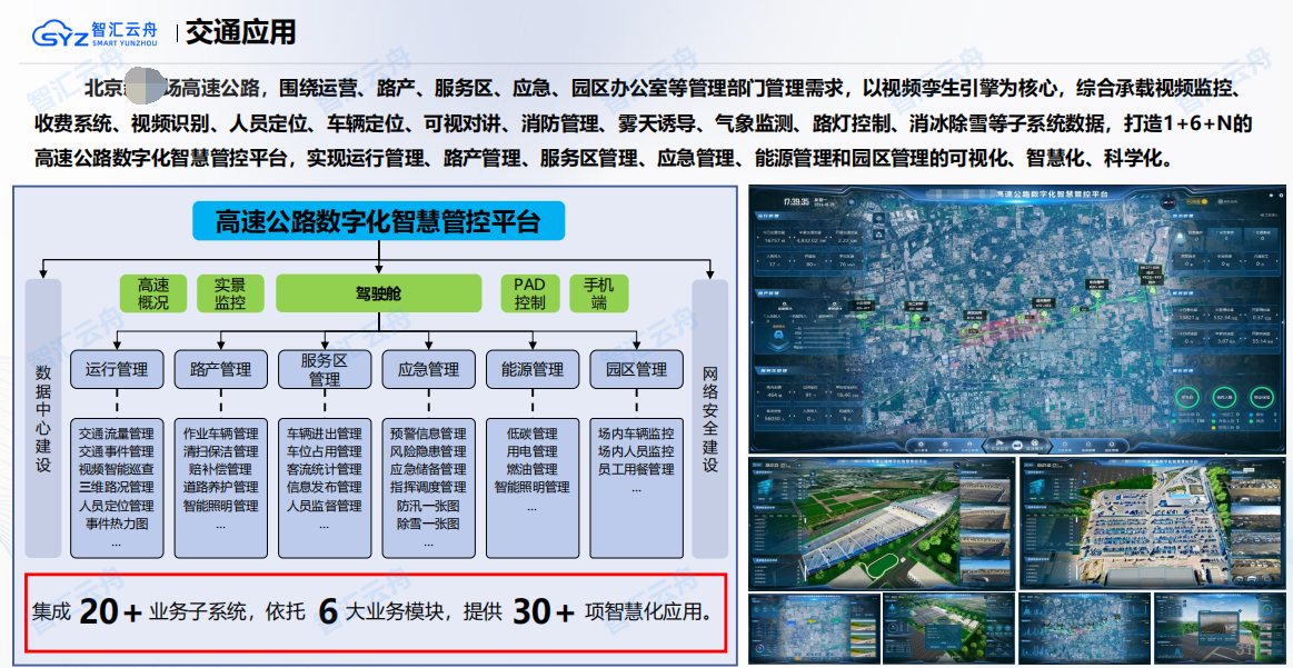 作为空间智能应用的先行者与视频孪生技术的首倡者智汇云舟的视频孪生智慧高速解决方案,综合运用三维地理信息、人工智能、视频融合及空间智能等技术,实现高速公路路网数字化的全面升级。方案基于时空承载底座与空间智能技术支撑,综合承载全量业务数据,实现数据集成共享、时空位置计算和三维可视化联动管理,打造沉浸式高速智慧管理大脑,助力高速公路更加智能、更加精细化的管理模式,从而实现高速公路“保安全”、“保畅通”、“保稳定”、“保运营”、“保服务”等场景化目标。