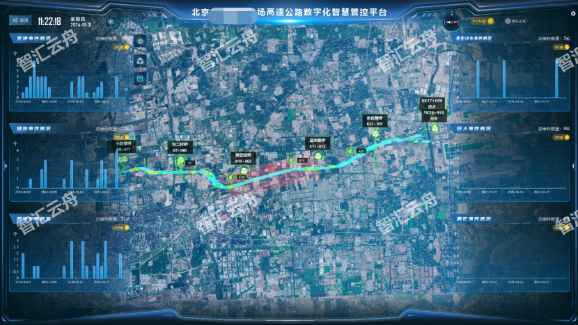 系统对接整合气象预报、高速水位监测、气象监测、拥堵事件监测、能见度监测、降雨量监测、降雪量监测、预警发布等高速预警信息,通过空间智能数据融合分析技术对数据进行统计分析,定制高速可视化专题,通过图表形式直观展示核心数据,并实现数据下钻,联动三维场景进行详情数据查看和业务处置,便捷掌控高速应急态势。