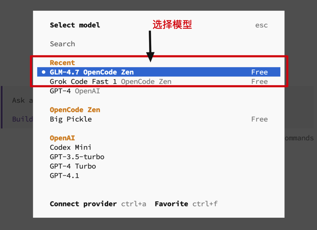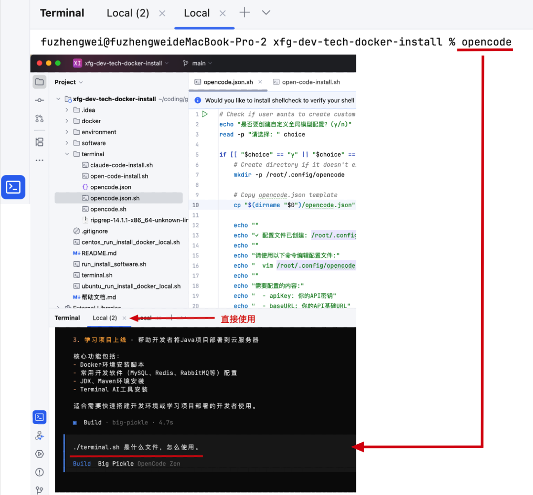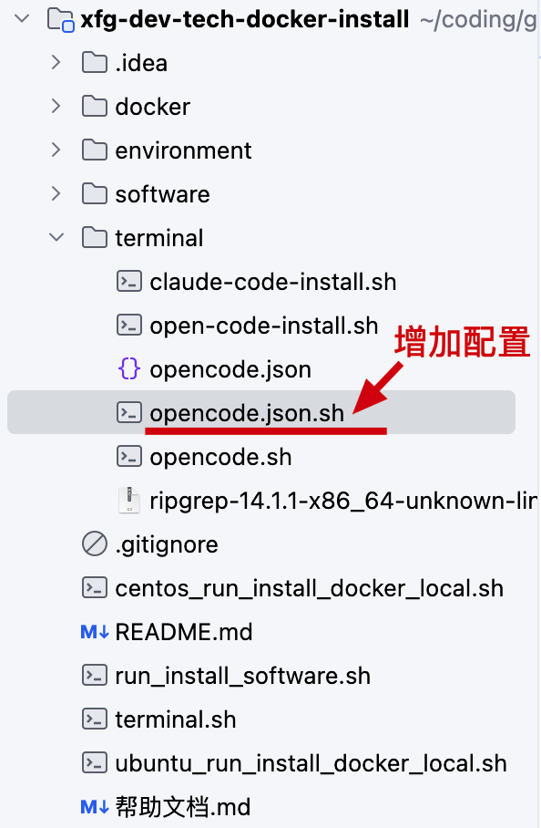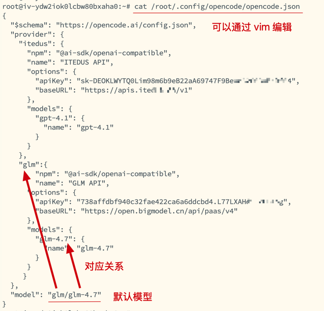 ./opencode.json.sh 进行创建。./opencode.json.sh 之后想更换配置的模型,则可以通过 vim 命令,编辑 /root/.config/opencode/opencode.json