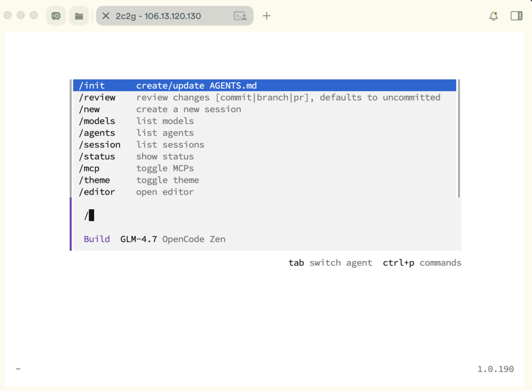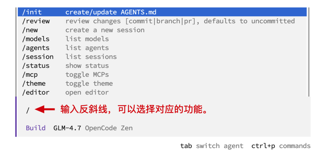 /init - 创建/更新 Agents.md"/review - 检查变化"/new - 创建新的会话"/models - 选择模型"/agents - 智能体方式"/session - 会话列表"/status - 查看状态"/mcp - 选择mcp服务"/theme - 选择主题"/editor - 编辑"/connect - 链接模型提供者"/help - 帮助"/commands - 命令"/exit - 调试模式"这些可能会随着版本更新而调整,你可以依次尝试下。