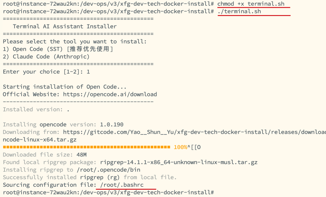 opencode 之后 Enter(回车)进入到系统中。如果提示 opencode 不是有效的命令,可以检查是否安装过程中有个提示 source .../bashrc 可以自行执行刷新。