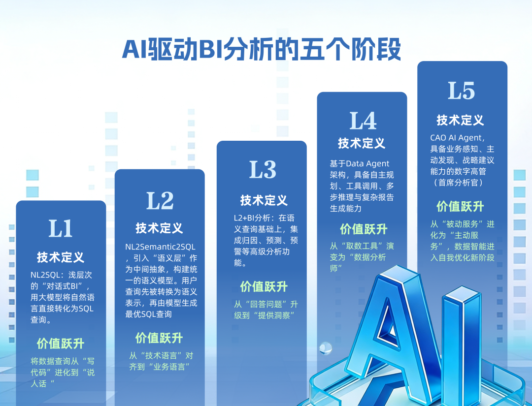 但开普云的视野并未止步于此。“我认为AI驱动数据分析共分为五个技术层级。” 开普云副总裁、AI事业部总经理倪金松,提出了更具前瞻性的技术世界观。