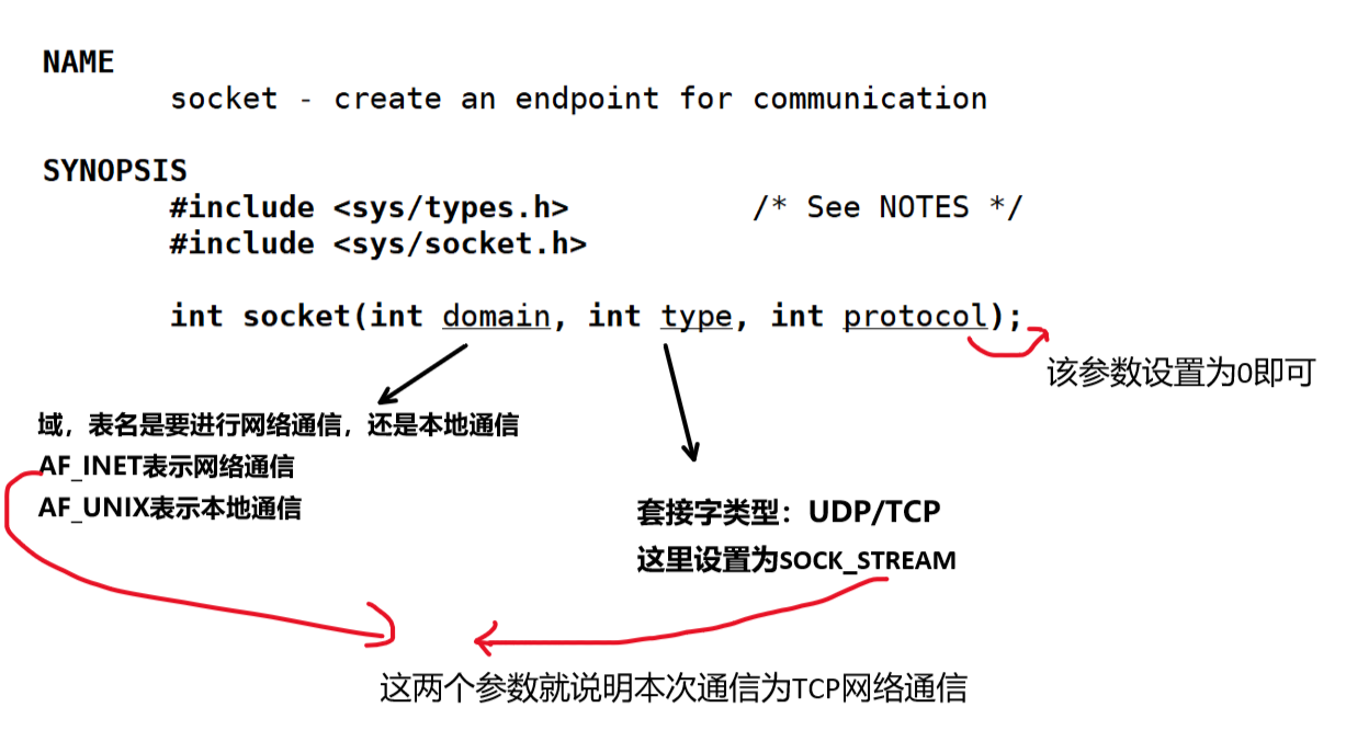 NAME socket - create an endpoint for communication SYNOPSIS #include <sys/types.h> /* See NOTES */ #include <sys/socket.h> int socket(int domain, int type, int protocol);