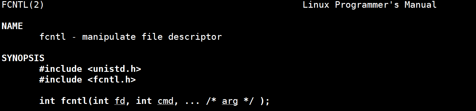 C #include <unistd.h> #include <fcntl.h> int fcntl(int fd, int cmd, ... /* arg */ );