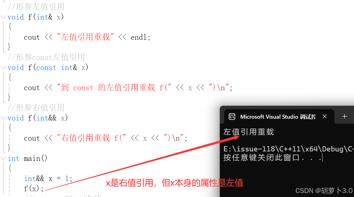 cout << "到 const 的左值引⽤重载 f(" << x << ")\n";