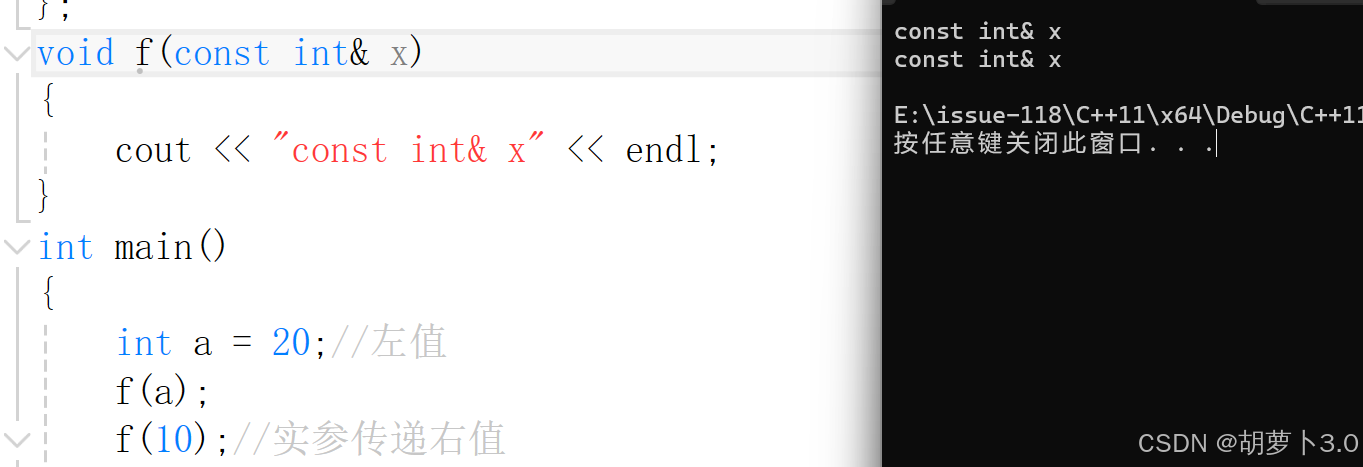 f(10);//调用f(int&&),如果没有f(int&&)重载则会调用f(const int&)
