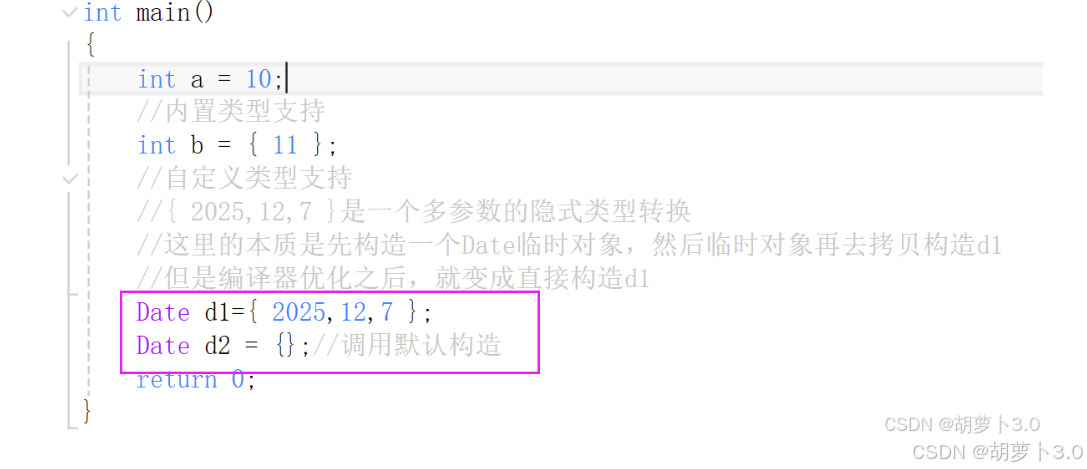 // 临时对象再去拷⻉构造d1,编译器优化后合⼆为⼀变成{ 2025, 1, 1}直接构造初始化d1