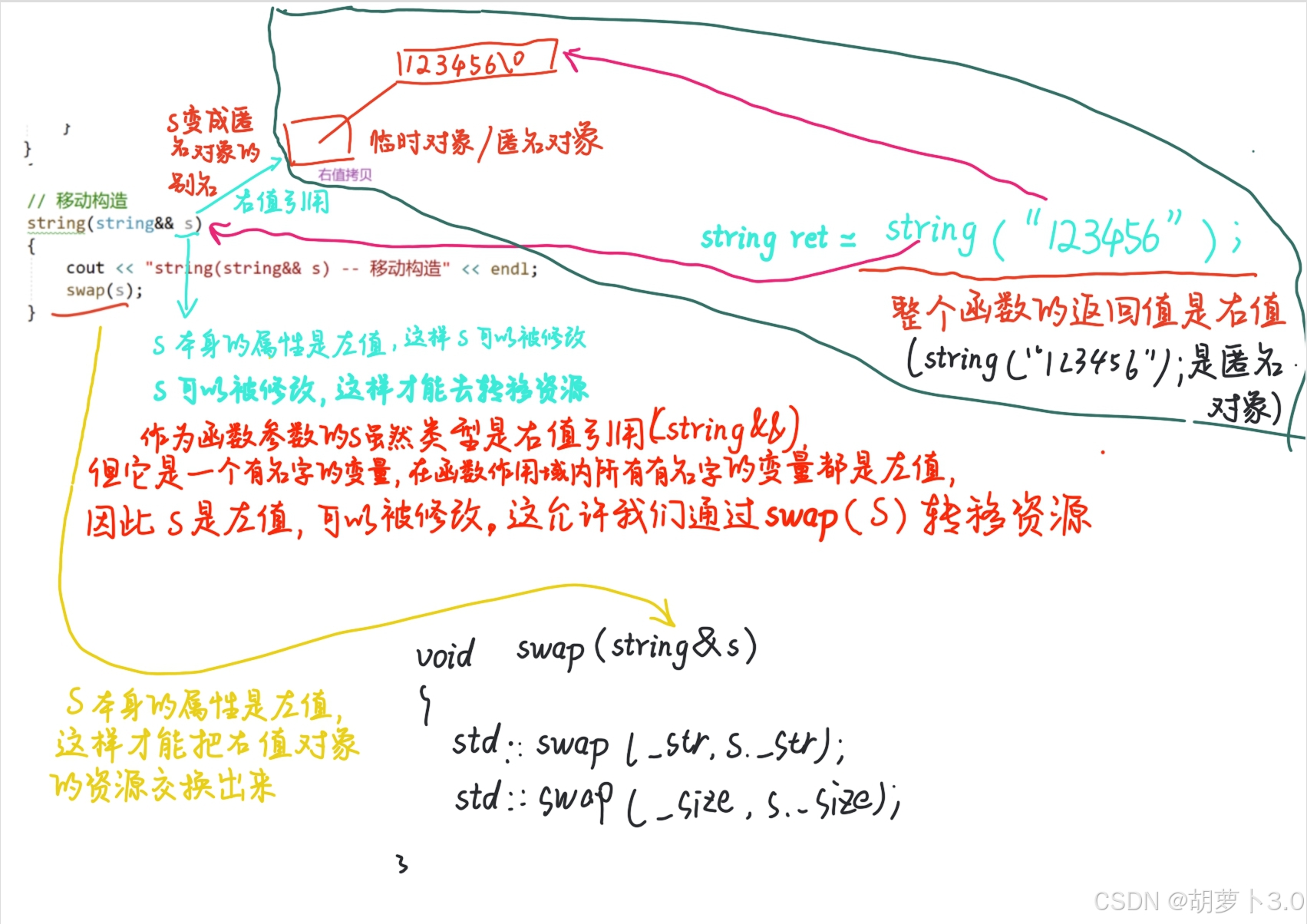 既然你是一个右值,并且马上就要析构了,我就不去执行拷贝了,直接把你的资源转移给我,然后我再去转移给其他人,这样就不浪费了~