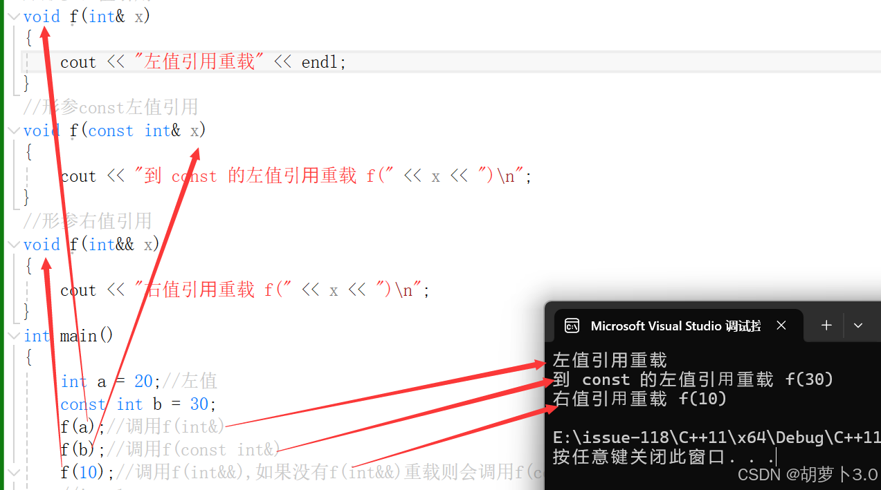 通过上面的代码,我们可以看出当分别重载左值引用、const左值引用、右值引用作为形参的函数,左值会去调用左值引用的,const左值会去调用const左值引用的,右值会去调用右值引用的