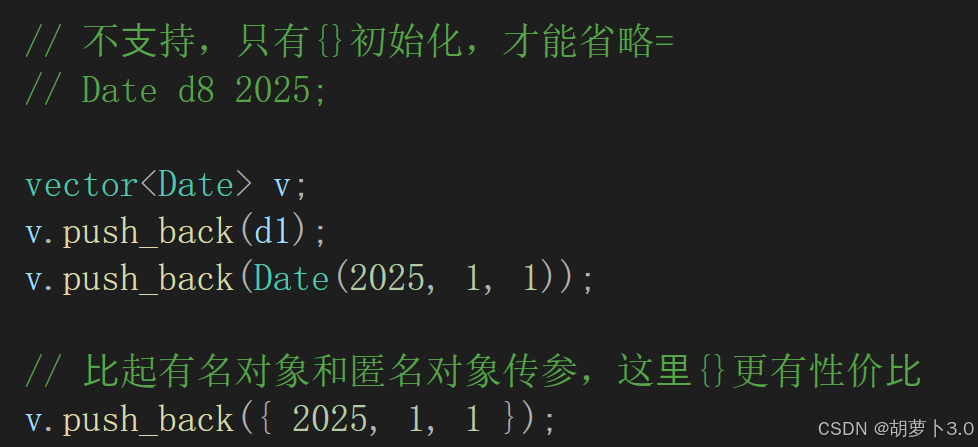 // 这⾥本质是⽤{ 2025, 1, 1}构造⼀个Date临时对象
