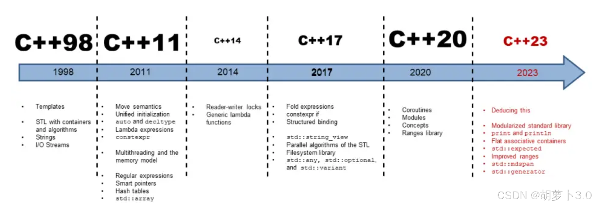 C++11是C++的第二个主要版本,并且是从C++98起的最重要更新。它引入了大量更改,标准化了既有实践,并改正了C++程序员可用的抽象。在它最终由ISO在2011年8月12日采纳前,人们曾使用名称“C++0x”,因为它曾被期待在2010年之前发布。C++03与C++11期间花了8年时间,故而这是迄今为止最长的版本间隔。从那时起,C++有规律地每3年更新一次
