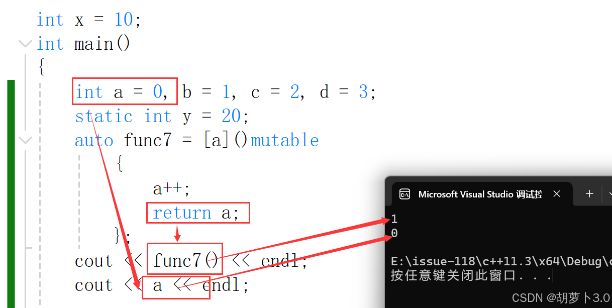 但是加上mutable就相当于去掉了const属性,就可以修改了,但是这种修改不会影响外面被捕捉的对象,只能影响里面的对象,因为值捕捉是一种拷贝——
