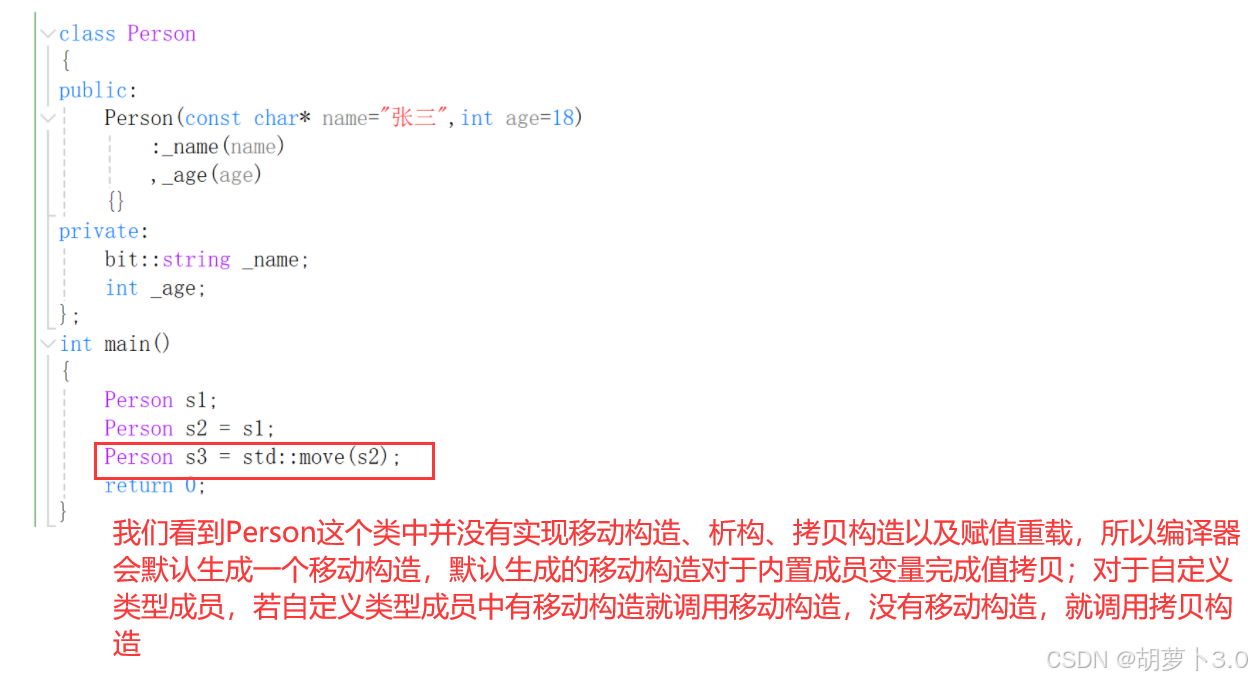 如果你没有自己实现移动构造函数,并且没有实现析构函数、拷贝构造、拷贝赋值重载中的任意一个,(换句话来说:就是没有实现移动构造、析构函数、拷贝构造、拷贝赋值重载),那么编译器会自动生成一个默认移动构造(若实现了其中一个,编译器都不会生成默认移动构造)