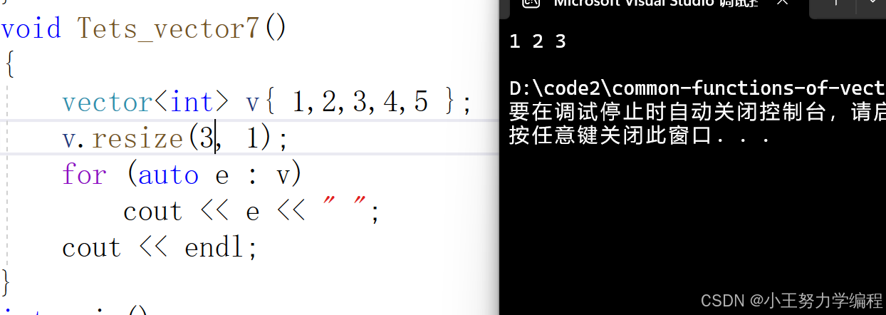 void Test_vector10() { vector<int> v; for (int i = 1; i <= 5; i++) { v.push_back(i); //将1、2、3、4、5 依次插入v的队尾 } v.erase(v.begin() + 1, v.begin() + 3); //删除2和3 for (auto it = v.begin(); it != v.end(); it++) { cout << *it << " "; } }