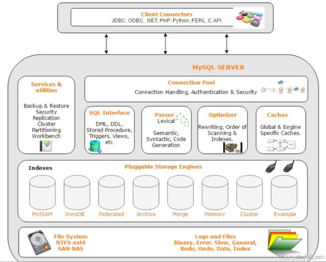 1,连接层(Client Connectors):负责客户端与mysql服务器的通信。支持各种主流的编程技术:如Java、C、Python、.NET等,通过各自的API技术与MySQL建立连接。